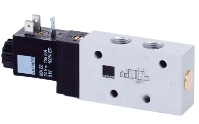 یکی از مدل ها: مدل [HAFNER 1/4″ FNPT ۵/۲ Way Solenoid Valve] که دارای رابط NAMUR است (برای اتصال به اکچوِیتور NAMUR) و سایز ¼ اینچ.