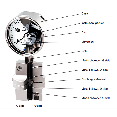 محفظه سیالات در سمت ⊕ و ⊖ توسط المنت دیافراگمی از هم جدا می شوند. همچنین بیلوز فلزی محفظه سیالات را از اتمسفر ایزوله می کند. اختلاف فشار بین سمت ⊕ و ⊖ در گیج اختلاف فشار منجر به انحراف المنت اندازه گیری دیافراگمی می شود.